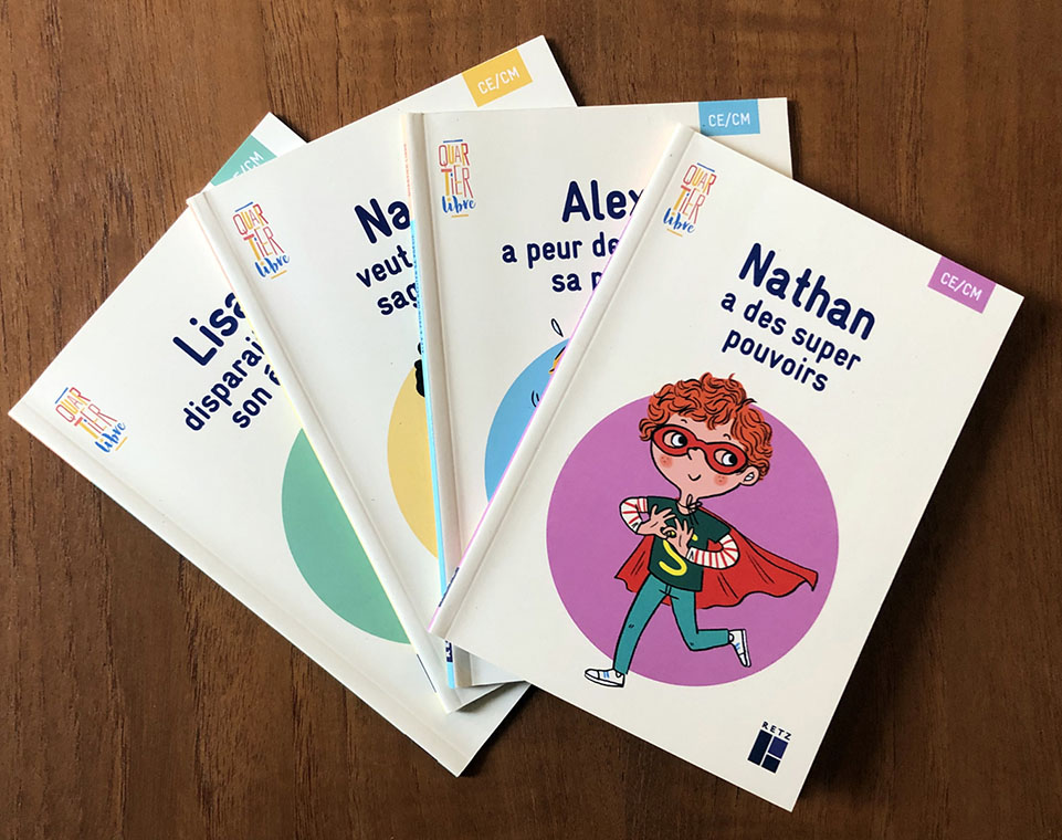Nous avons conçu et réalisé la collection de romans Quartier Libre. Cette série aborde des sujets d’EMC écrits par Boualem Aznag et Stéphane Grulet, la team de Parents-Profs. Cette collection à destination d’élèves de CE1 à CM2 a pour but de combattre le harcèlement et de favoriser le vivre ensemble. Illustrations par Mary Gribouille. Chaque ouvrage fait 34 pages, format 14x21cm, quadri offset.