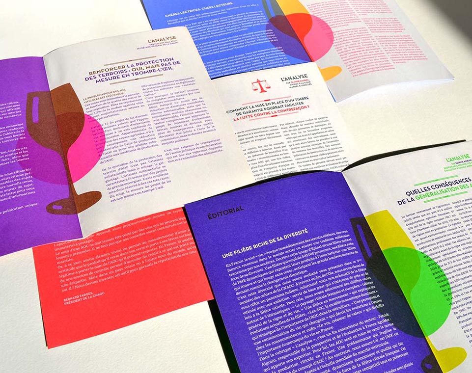 Nous avons pensé et réalisé, en collaboration avec Jean-Baptiste Dunesme, une publication trimestrielle qui met en valeur le travail de protection des vins fait par la Confédération Nationale des producteurs de vins et eaux-de-vie de vin à Appellations d’Origine Contrôlées (CNAOC). Il s’agit de cahiers imprimés sur papier Munchen en 3 couleurs pantone avec une infographie poster centrale à collectionner.
